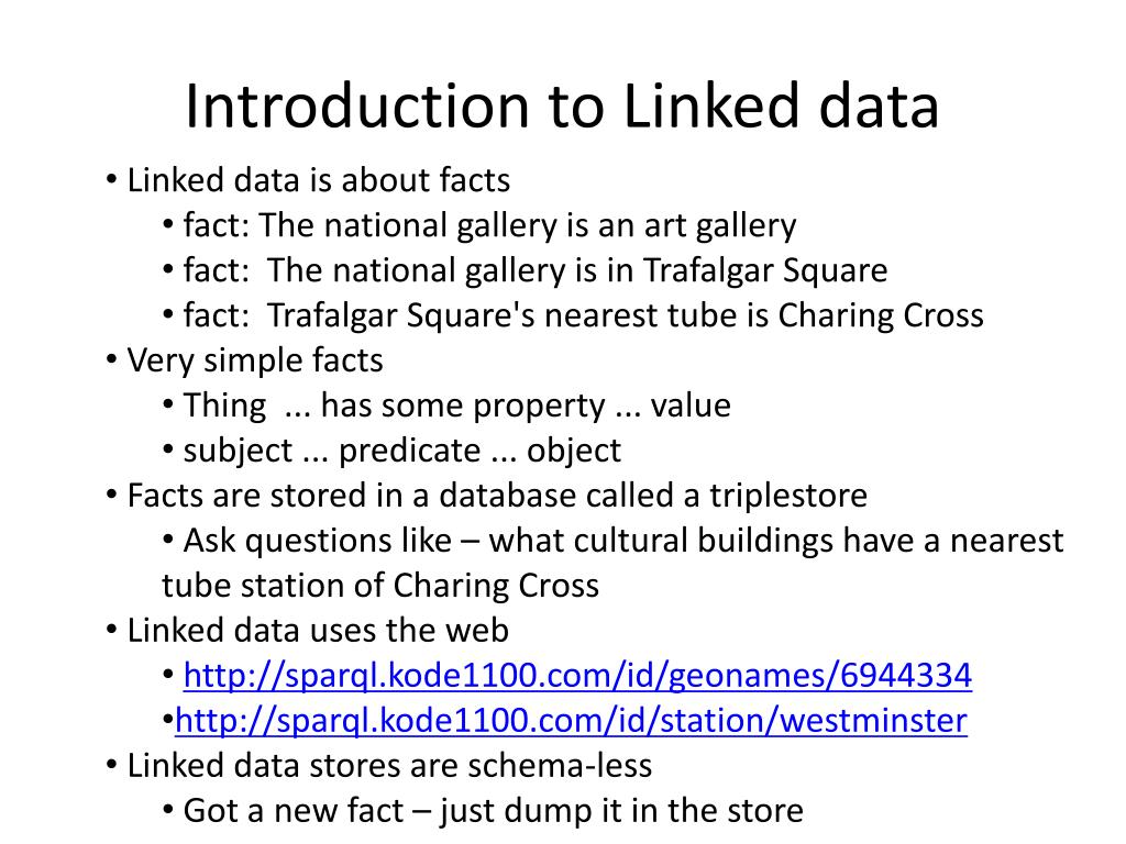 Introduction to Linked data • Linked data is about facts • fact: The national gallery is an art gallery • fact: The national gallery is in Trafalgar Square • fact: Trafalgar Square's nearest tube is Charing Cross • Very simple facts • Thing ... has some property ... value • subject ... predicate ... object • Facts are stored in a database called a triplestore • Ask questions like – what cultural buildings have a nearest tube station of Charing Cross • Linked data uses the web • http://sparql.kode1100.com/id/geonames/6944334 • http://sparql.kode1100.com/id/station/westminster • Linked data stores are schema-less • Got a new fact – just dump it in the store