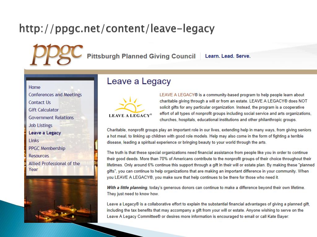 Cultivating Bequests Small Shop or Large, STILL the Greatest ROI Pittsburgh Planned Giving Council- Leave A Legacy Committee Emerging Philanthropy Conference April 26, 2012