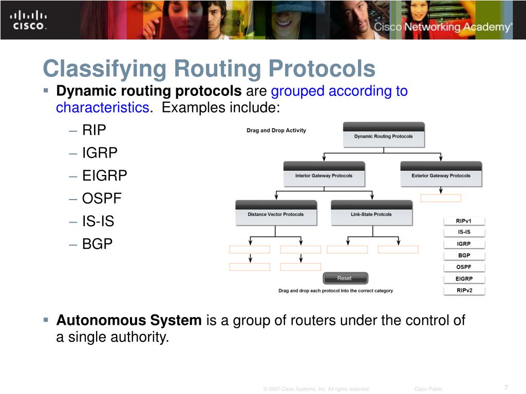 Classifying Routing Protocols • Dynamic routing protocols are grouped according to characteristics. Examples include: • RIP • IGRP • EIGRP • OSPF • IS-IS • BGP • Autonomous System is a group of routers under the control of a single authority.