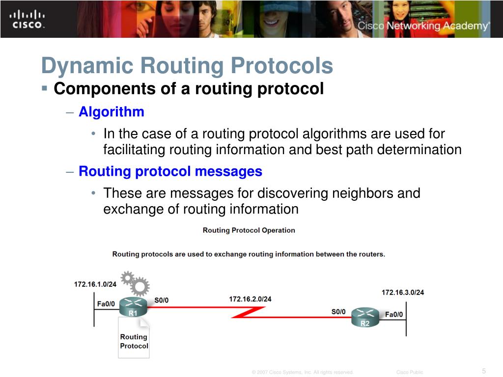 Dynamic Routing Protocols • Components of a routing protocol • Algorithm • In the case of a routing protocol algorithms are used for facilitating routing information and best path determination • Routing protocol messages • These are messages for discovering neighbors and exchange of routing information