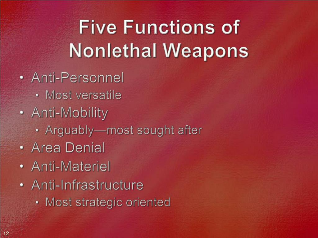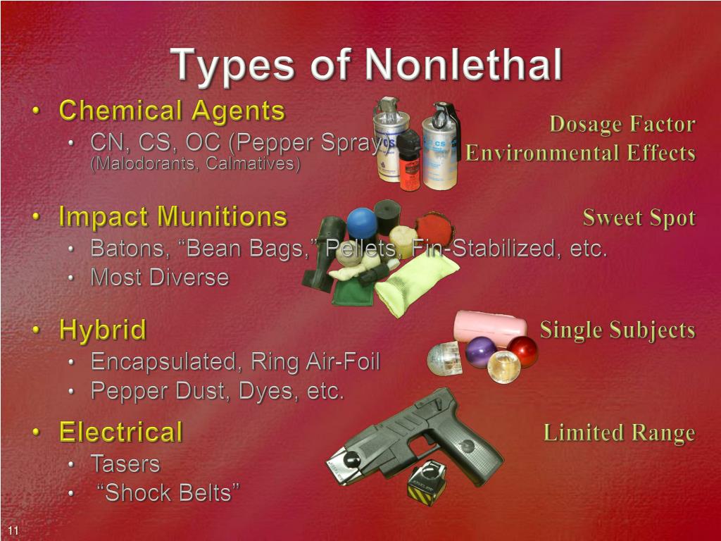Types of Nonlethal Dosage FactorEnvironmental Effects • Chemical Agents • CN, CS, OC (Pepper Spray)(Malodorants, Calmatives) Sweet Spot • Impact Munitions • Batons, “Bean Bags,” Pellets, Fin-Stabilized, etc. • Most Diverse Single Subjects • Hybrid • Encapsulated, Ring Air-Foil • Pepper Dust, Dyes, etc. Limited Range • Electrical • Tasers • “Shock Belts” 11