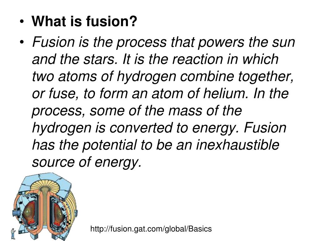 http://fusion.gat.com/global/Basics • What is fusion? • Fusion is the process that powers the sun and the stars. It is the reaction in which two atoms of hydrogen combine together, or fuse, to form an atom of helium. In the process, some of the mass of the hydrogen is converted to energy. Fusion has the potential to be an inexhaustible source of energy.