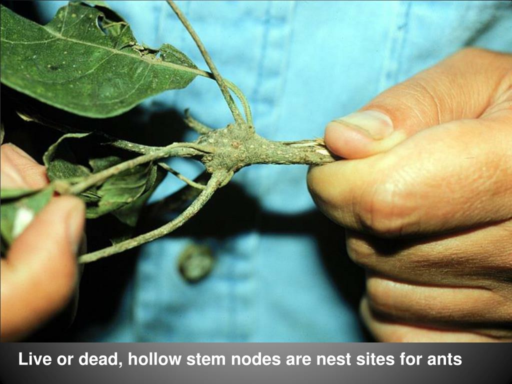 Symbiosis: Mutualism. Ant trees: the ants and the acacia tree. Ant trees: Cordia nodosa and: Allomerus octoarticulatus. Cordia nodosa. Live or dead, hollow stem nodes are nest sites for ants.