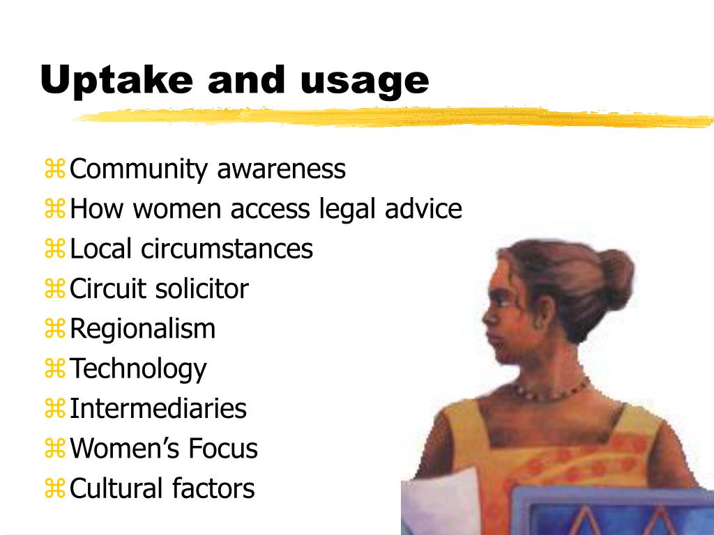 Uptake and usage • Community awareness • How women access legal advice • Local circumstances • Circuit solicitor • Regionalism • Technology • Intermediaries • Women’s Focus • Cultural factors