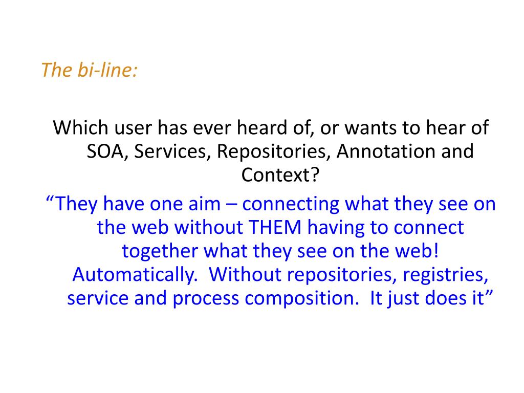 The bi-line: Which user has ever heard of, or wants to hear of SOA, Services, Repositories, Annotation and Context? “They have one aim – connecting what they see on the web without THEM having to connect together what they see on the web! Automatically. Without repositories, registries, service and process composition. It just does it”