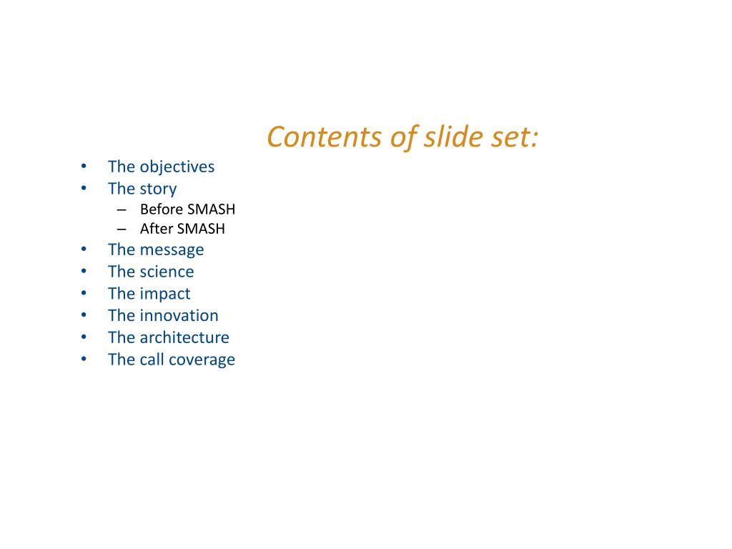 Contents of slide set: The objectives The story Before SMASH After SMASH The message The science The impact The innovation The architecture The call coverage