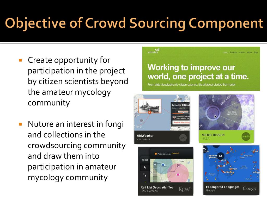 Objective of Crowd Sourcing Component • Create opportunity for participation in the project by citizen scientists beyond the amateur mycology community • Nuture an interest in fungi and collections in the crowdsourcing community and draw them into participation in amateur mycology community
