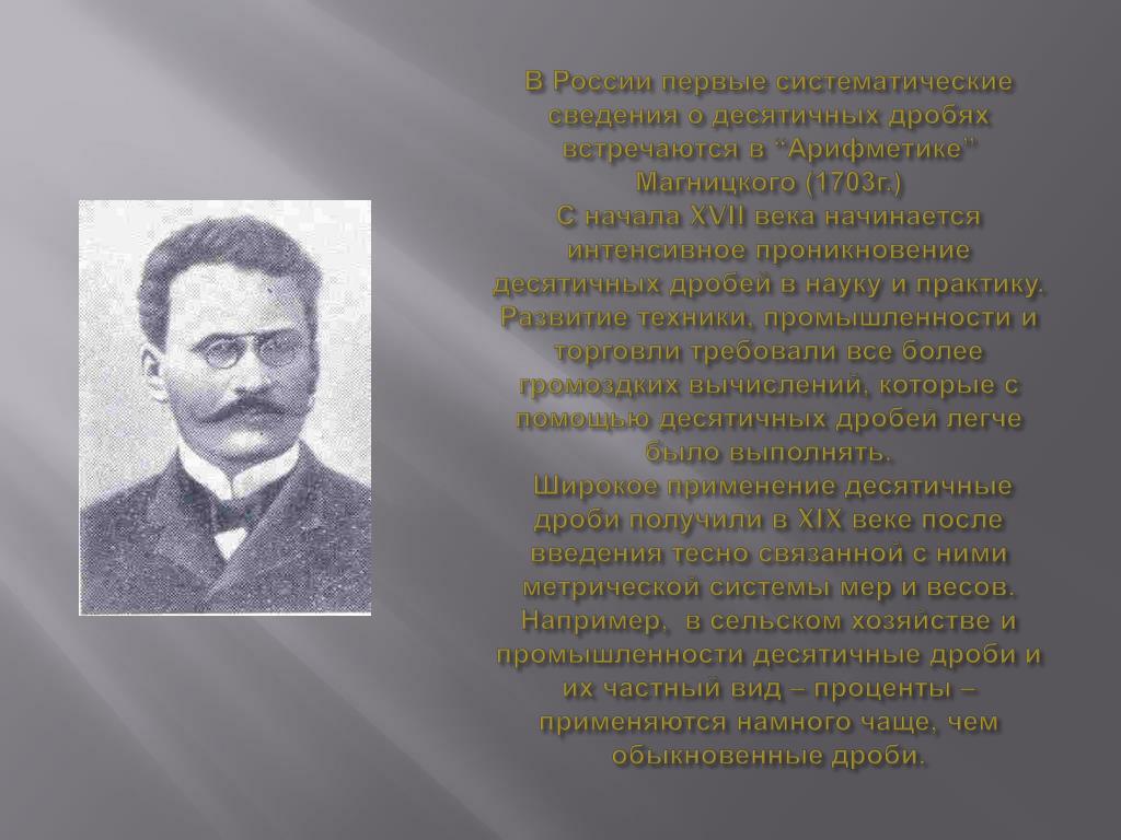 В России первые систематические сведения о десятичных дробях встречаются в “Арифметике” Магницкого (1703г.)С начала XVII века начинается интенсивное проникновение десятичных дробей в науку и практику. Развитие техники, промышленности и торговли требовали все более громоздких вычислений, которые с помощью десятичных дробей легче было выполнять. Широкое применение десятичные дроби получили в XIX веке после введения тесно связанной с ними метрической системы мер и весов. Например, в сельском хозяйстве и промышленности десятичные дроби и их частный вид – проценты – применяются намного чаще, чем обыкновенные дроби.