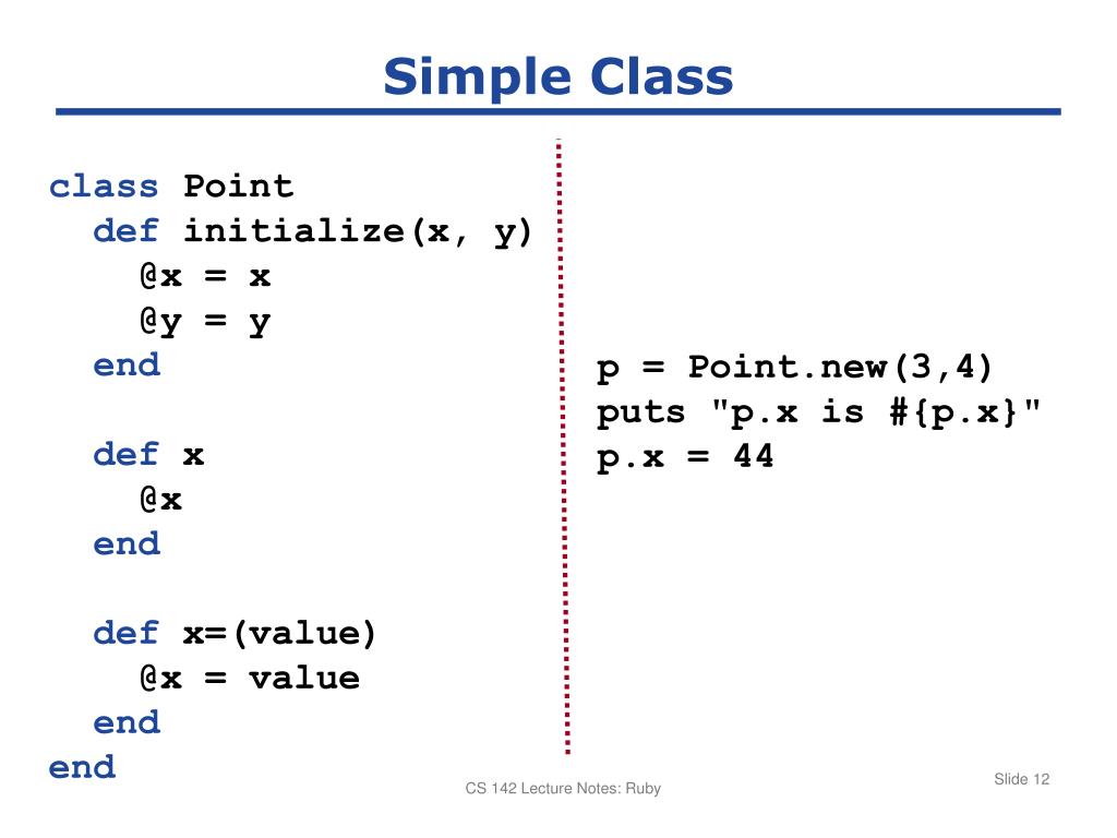 Simple Class class Point definitialize(x, y) @x = x @y = y end defx @x end defx=(value) @x = value end end p = Point.new(3,4) puts "p.x is #{p.x}" p.x= 44 CS 142 Lecture Notes: Ruby