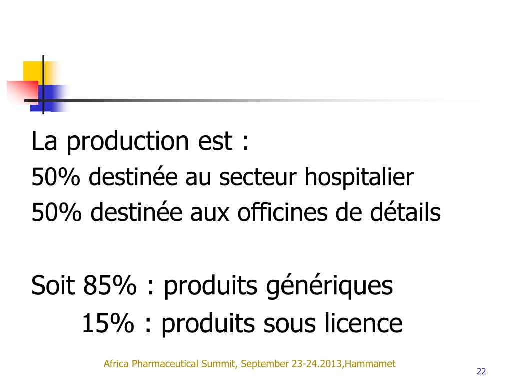 Africa Pharmaceutical Summit, September 23-24.2013,Hammamet La production est : 50% destinée au secteur hospitalier 50% destinée aux officines de détails Soit 85% : produits génériques 15% : produits sous licence 22