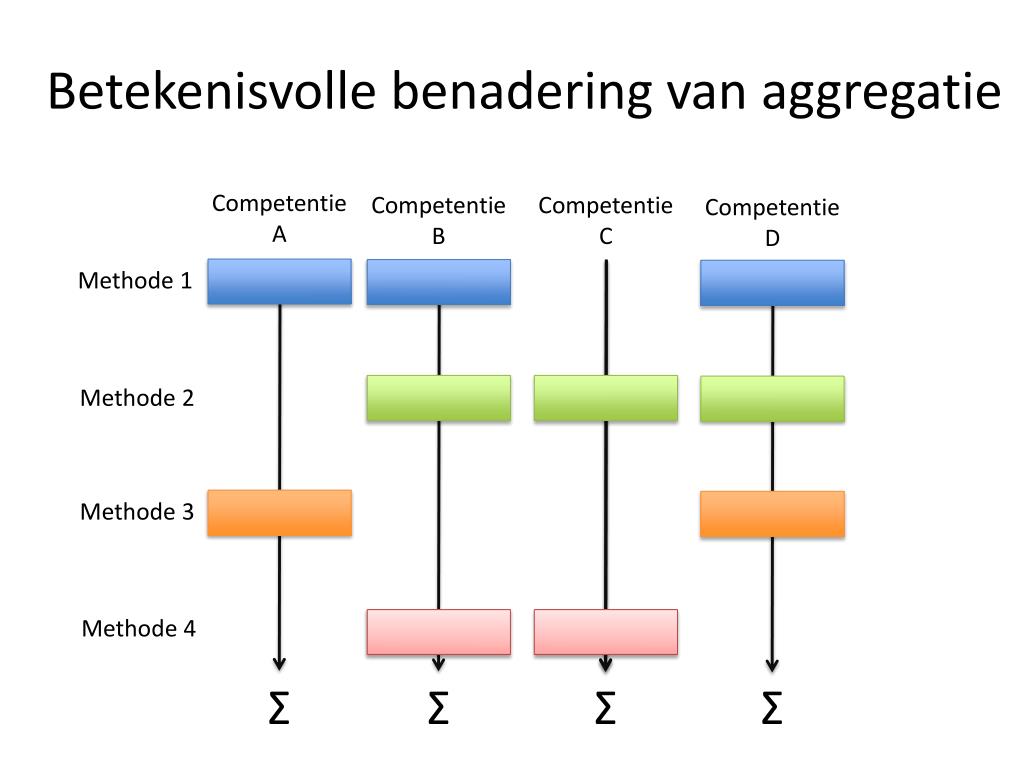 Betekenisvolle benadering van aggregatie Competentie A Competentie B Competentie C Competentie D Methode 1 Methode 2 Methode 3 Methode 4 Σ Σ Σ Σ