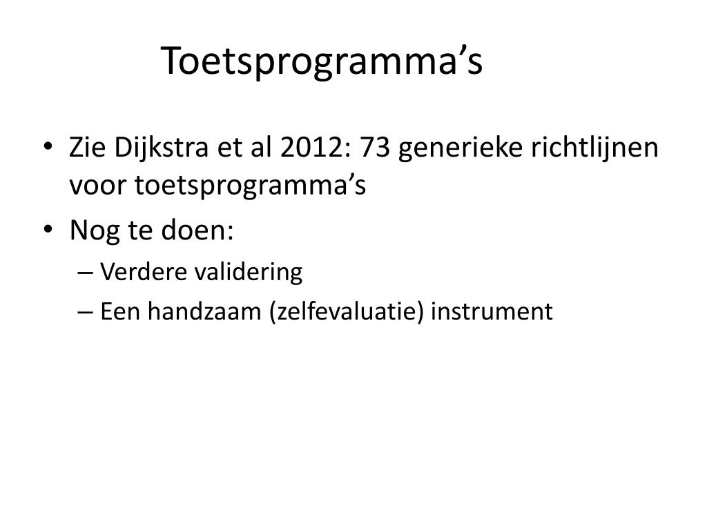 Toetsprogramma’s • Zie Dijkstra et al 2012: 73 generieke richtlijnen voor toetsprogramma’s • Nog te doen: • Verdere validering • Een handzaam (zelfevaluatie) instrument