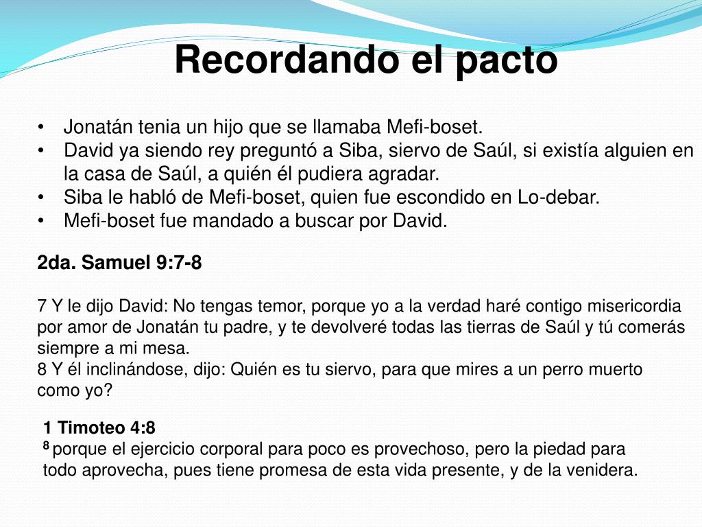 Recordando el pacto • Jonatán tenia un hijo que se llamaba Mefi-boset. • David ya siendo rey preguntó a Siba, siervo de Saúl, si existía alguien en la casa de Saúl, a quién él pudiera agradar. • Siba le habló de Mefi-boset, quien fue escondido en Lo-debar. • Mefi-boset fue mandado a buscar por David. • 2da. Samuel 9:7-8 • 7 Y le dijo David: No tengas temor, porque yo a la verdad haré contigo misericordia • por amor de Jonatán tu padre, y te devolveré todas las tierras de Saúl y tú comerás • siempre a mi mesa. • 8 Y él inclinándose, dijo: Quién es tu siervo, para que mires a un perro muerto • como yo? 1 Timoteo 4:8 8porque el ejercicio corporal para poco es provechoso, pero la piedad para todo aprovecha, pues tiene promesa de esta vida presente, y de la venidera.