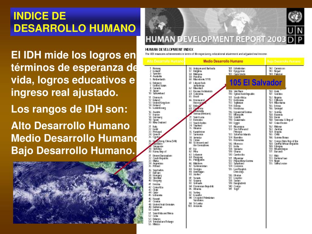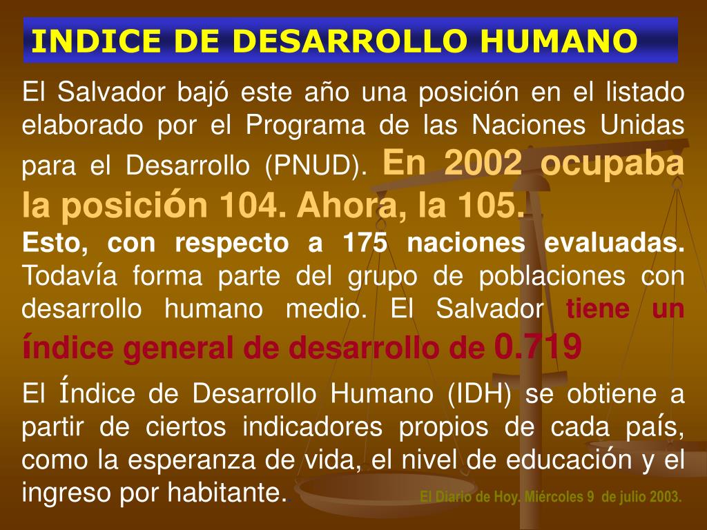 INDICE DE DESARROLLO HUMANO El Salvador bajó este año una posición en el listado elaborado por el Programa de las Naciones Unidas para el Desarrollo (PNUD).En 2002 ocupaba la posición 104. Ahora, la 105. Esto, con respecto a 175 naciones evaluadas. Todavía forma parte del grupo de poblaciones con desarrollo humano medio.El Salvador tiene un índice general de desarrollo de 0.719 El Índice de Desarrollo Humano (IDH) se obtiene a partir de ciertos indicadores propios de cada país, como la esperanza de vida, el nivel de educación y el ingreso por habitante.. El Diario de Hoy. Miércoles 9 de julio 2003.
