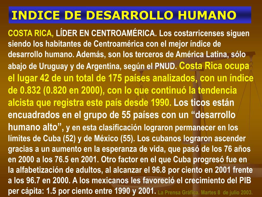 INDICE DE DESARROLLO HUMANO COSTA RICA, LÍDER EN CENTROAMÉRICA. Los costarricenses siguen siendo los habitantes de Centroamérica con el mejor índice de desarrollo humano. Además, son los terceros de América Latina, sólo abajo de Uruguay y de Argentina, según el PNUD.Costa Rica ocupa el lugar 42 de un total de 175 países analizados, con un índice de 0.832 (0.820 en 2000), con lo que continuó la tendencia alcista que registra este país desde 1990.Los ticos están encuadrados en el grupo de 55 países con un “desarrollo humano alto”, y en esta clasificación lograron permanecer en los límites de Cuba (52) y de México (55). Los cubanos lograron ascender gracias a un aumento en la esperanza de vida, que pasó de los 76 años en 2000 a los 76.5 en 2001. Otro factor en el que Cuba progresó fue en la alfabetización de adultos, al alcanzar el 96.8 por ciento en 2001 frente a los 96.7 en 2000. A los mexicanos les favoreció el crecimiento del PIB per cápita: 1.5 por ciento entre 1990 y 2001. La Prensa Gráfica. Martes 8 de julio 2003.