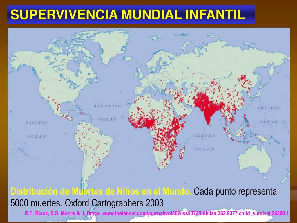 SUPERVIVENCIA MUNDIAL INFANTIL Distribución de Muertes de Niños en el Mundo. Cada punto representa 5000 muertes. Oxford Cartographers 2003 R.E. Black, S.S. Morris & J. Bryce. www.thelancet.com/journal/vol362/iss9377/full/llan.362.9377.child_survival.26360.1