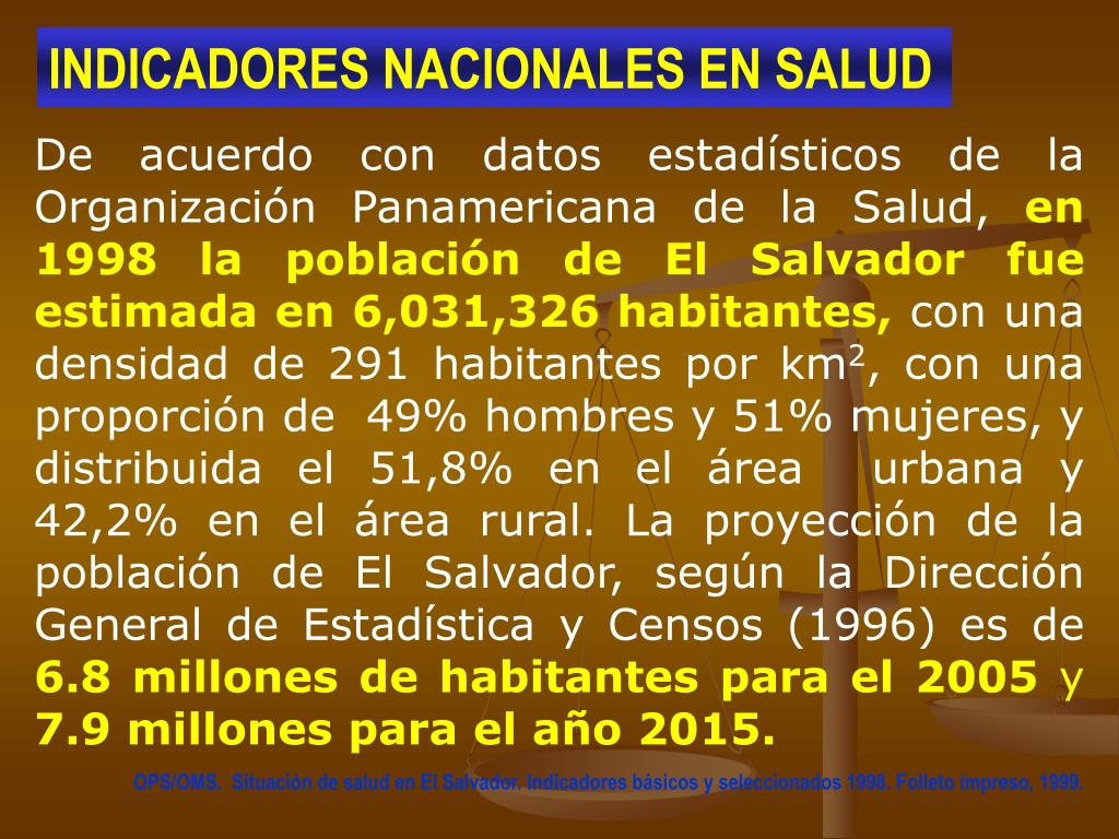 INDICADORES NACIONALES EN SALUD De acuerdo con datos estadísticos de la Organización Panamericana de la Salud, en 1998 la población de El Salvador fue estimada en 6,031,326 habitantes, con una densidad de 291 habitantes por km2, con una proporción de 49% hombres y 51% mujeres, y distribuida el 51,8% en el área urbana y 42,2% en el área rural. La proyección de la población de El Salvador, según la Dirección General de Estadística y Censos (1996) es de 6.8 millones de habitantes para el 2005 y 7.9 millones para el año 2015. OPS/OMS. Situación de salud en El Salvador. Indicadores básicos y seleccionados 1998. Folleto impreso, 1999.