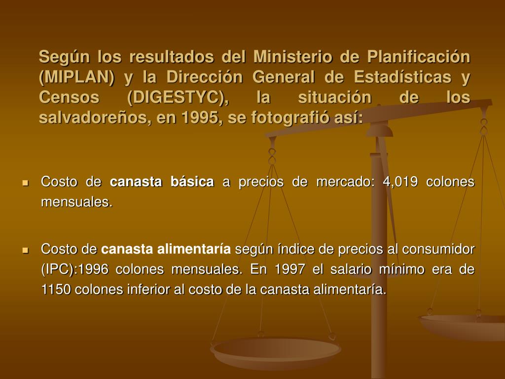 Segúnlosresultados del Ministerio de Planificación (MIPLAN) y la Dirección General de Estadísticas y Censos (DIGESTYC), la situación de los salvadoreños, en 1995, se fotografió así: • Costo de canasta básica a precios de mercado: 4,019 colones mensuales. • Costo de canasta alimentaría según índice de precios al consumidor (IPC):1996 colones mensuales. En 1997 el salario mínimo era de 1150 colones inferior al costo de la canasta alimentaría.