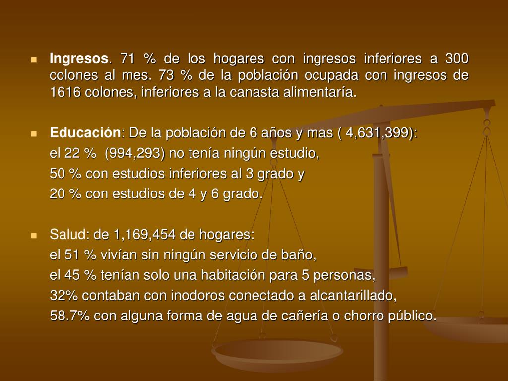 Ingresos. 71 % de los hogares con ingresos inferiores a 300 colones al mes. 73 % de la población ocupada con ingresos de 1616 colones, inferiores a la canasta alimentaría. • Educación: De la población de 6 años y mas ( 4,631,399): el 22 % (994,293) no tenía ningún estudio, 50 % con estudios inferiores al 3 grado y 20 % con estudios de 4 y 6 grado. • Salud: de 1,169,454 de hogares: el 51 % vivían sin ningún servicio de baño, el 45 % tenían solo una habitación para 5 personas, 32% contaban con inodoros conectado a alcantarillado, 58.7% con alguna forma de agua de cañería o chorro público.