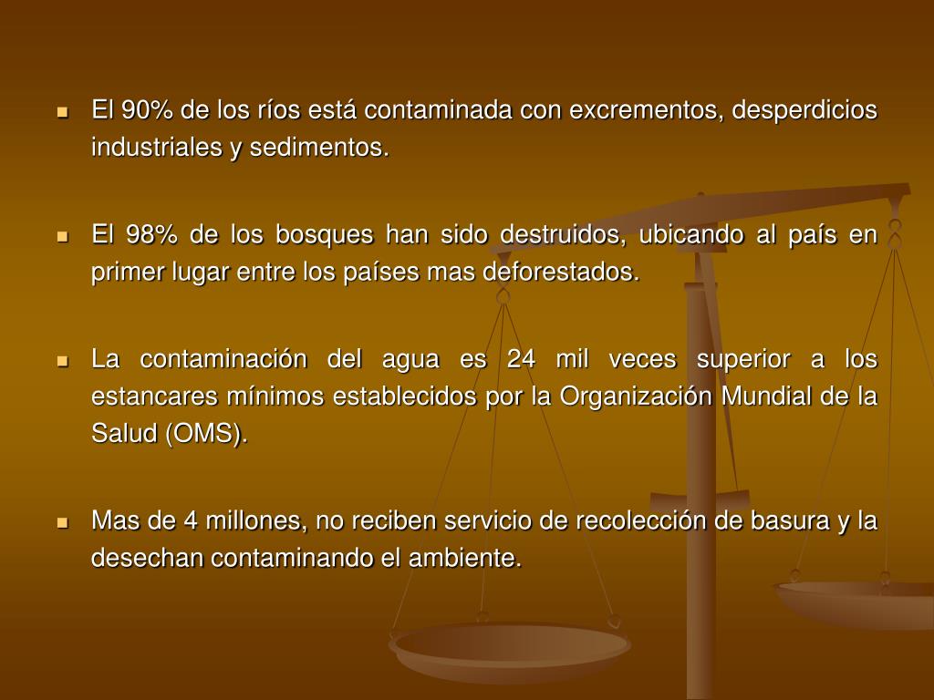 El 90% de los ríos está contaminada con excrementos, desperdicios industriales y sedimentos. • El 98% de los bosques han sido destruidos, ubicando al país en primer lugar entre los países mas deforestados. • La contaminación del agua es 24 mil veces superior a los estancares mínimos establecidos por la Organización Mundial de la Salud (OMS). • Mas de 4 millones, no reciben servicio de recolección de basura y la desechan contaminando el ambiente.