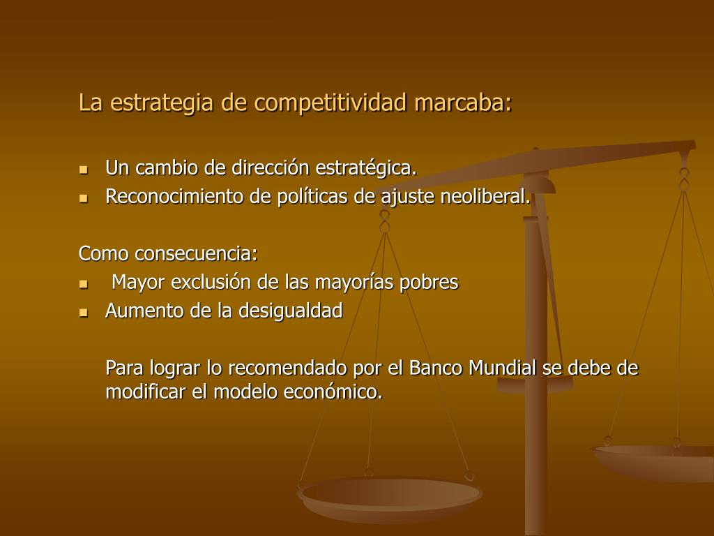 La estrategia de competitividad marcaba: • Un cambio de dirección estratégica. • Reconocimiento de políticas de ajuste neoliberal. Como consecuencia: • Mayor exclusión de las mayorías pobres • Aumento de la desigualdad Para lograr lo recomendado por el Banco Mundial se debe de modificar el modelo económico.