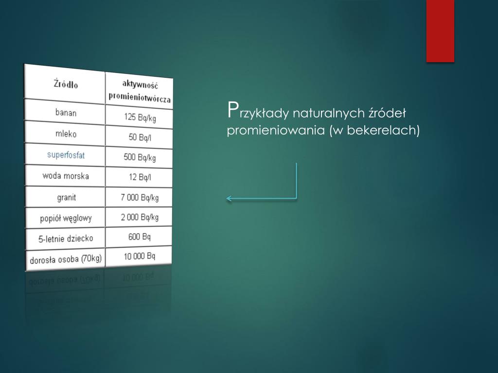 Przykłady naturalnych źródeł promieniowania (w bekerelach)