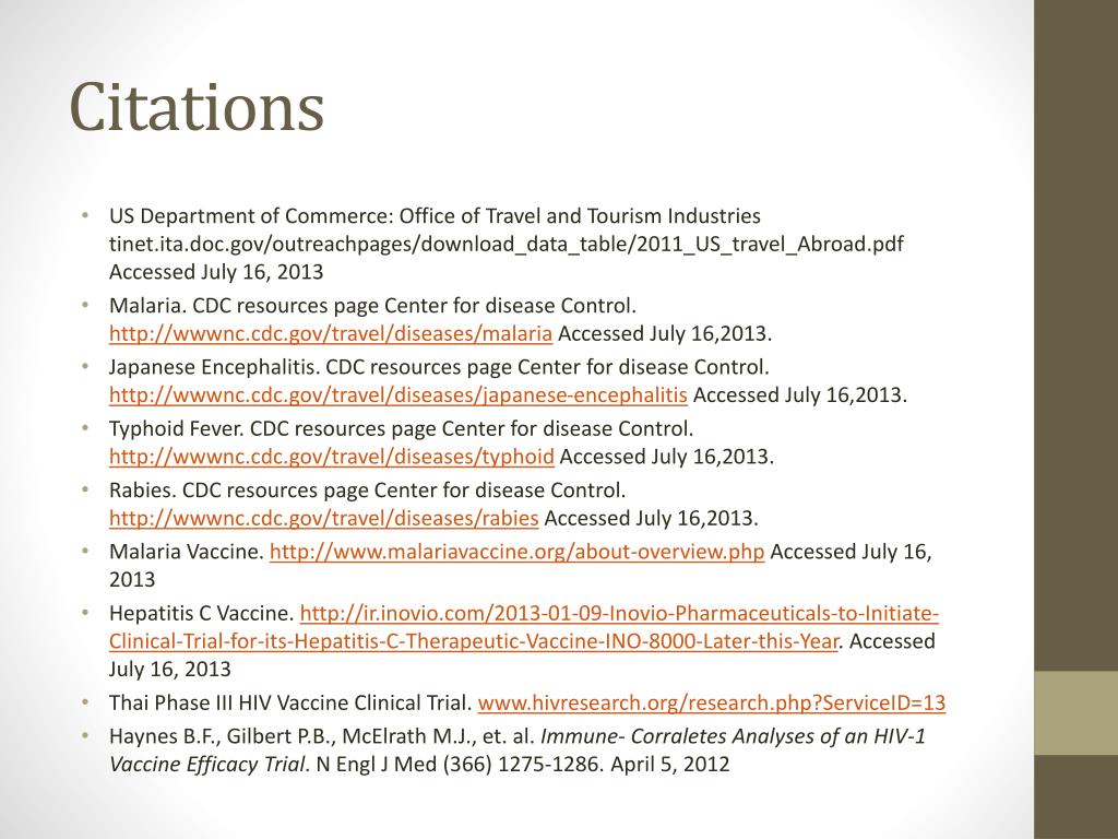 Citations • US Department of Commerce: Office of Travel and Tourism Industries tinet.ita.doc.gov/outreachpages/download_data_table/2011_US_travel_Abroad.pdf Accessed July 16, 2013 • Malaria. CDC resources page Center for disease Control. http://wwwnc.cdc.gov/travel/diseases/malaria Accessed July 16,2013. • Japanese Encephalitis. CDC resources page Center for disease Control. http://wwwnc.cdc.gov/travel/diseases/japanese-encephalitis Accessed July 16,2013. • Typhoid Fever. CDC resources page Center for disease Control. http://wwwnc.cdc.gov/travel/diseases/typhoid Accessed July 16,2013. • Rabies. CDC resources page Center for disease Control. http://wwwnc.cdc.gov/travel/diseases/rabies Accessed July 16,2013. • Malaria Vaccine. http://www.malariavaccine.org/about-overview.php Accessed July 16, 2013 • Hepatitis C Vaccine. http://ir.inovio.com/2013-01-09-Inovio-Pharmaceuticals-to-Initiate-Clinical-Trial-for-its-Hepatitis-C-Therapeutic-Vaccine-INO-8000-Later-this-Year. Accessed July 16, 2013 • Thai Phase III HIV Vaccine Clinical Trial. www.hivresearch.org/research.php?ServiceID=13 • Haynes B.F., Gilbert P.B., McElrath M.J., et. al. Immune- Corraletes Analyses of an HIV-1 Vaccine Efficacy Trial. N Engl J Med (366) 1275-1286. April 5, 2012