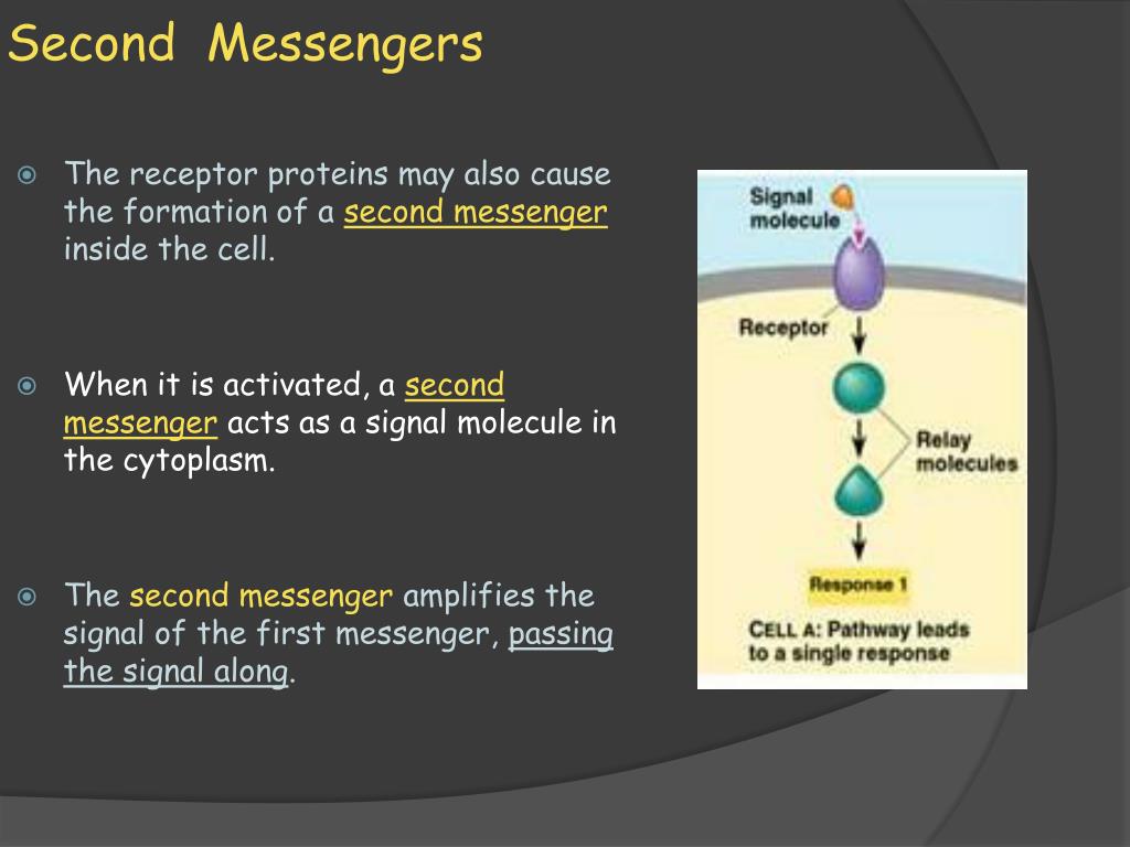 Second Messengers • The receptor proteins may also cause the formation of a second messenger inside the cell. • When it is activated, a second messenger acts as a signal molecule in the cytoplasm. • The second messenger amplifies the signal of the first messenger, passing the signal along.