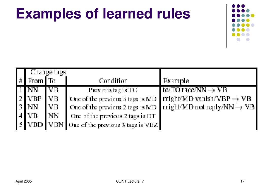 Transformation-Based Tagging • A combination of rule-based and stochastic tagging methodologies: • like the rule-based tagging because rules are used to specify tags in a certain environment; • like stochastic tagging, because machine learning is used. • uses Transformation-Based Learning (TBL) • Input: • tagged corpus dictionary (with most frequent tags) CLINT Lecture IV
