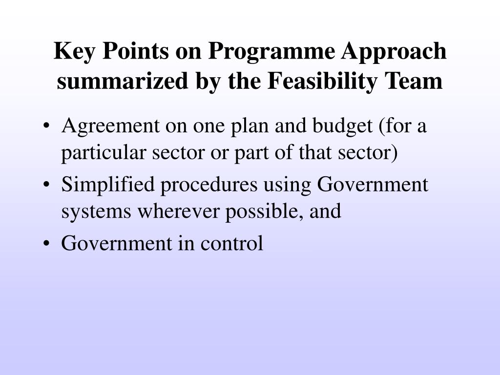 Key Points on Programme Approach summarized by the Feasibility Team • Agreement on one plan and budget (for a particular sector or part of that sector) • Simplified procedures using Government systems wherever possible, and • Government in control