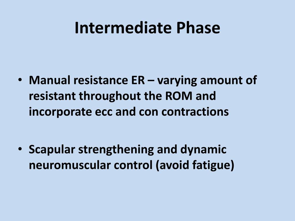 Intermediate Phase • Manual resistance ER – varying amount of resistant throughout the ROM and incorporate ecc and con contractions • Scapular strengthening and dynamic neuromuscular control (avoid fatigue)