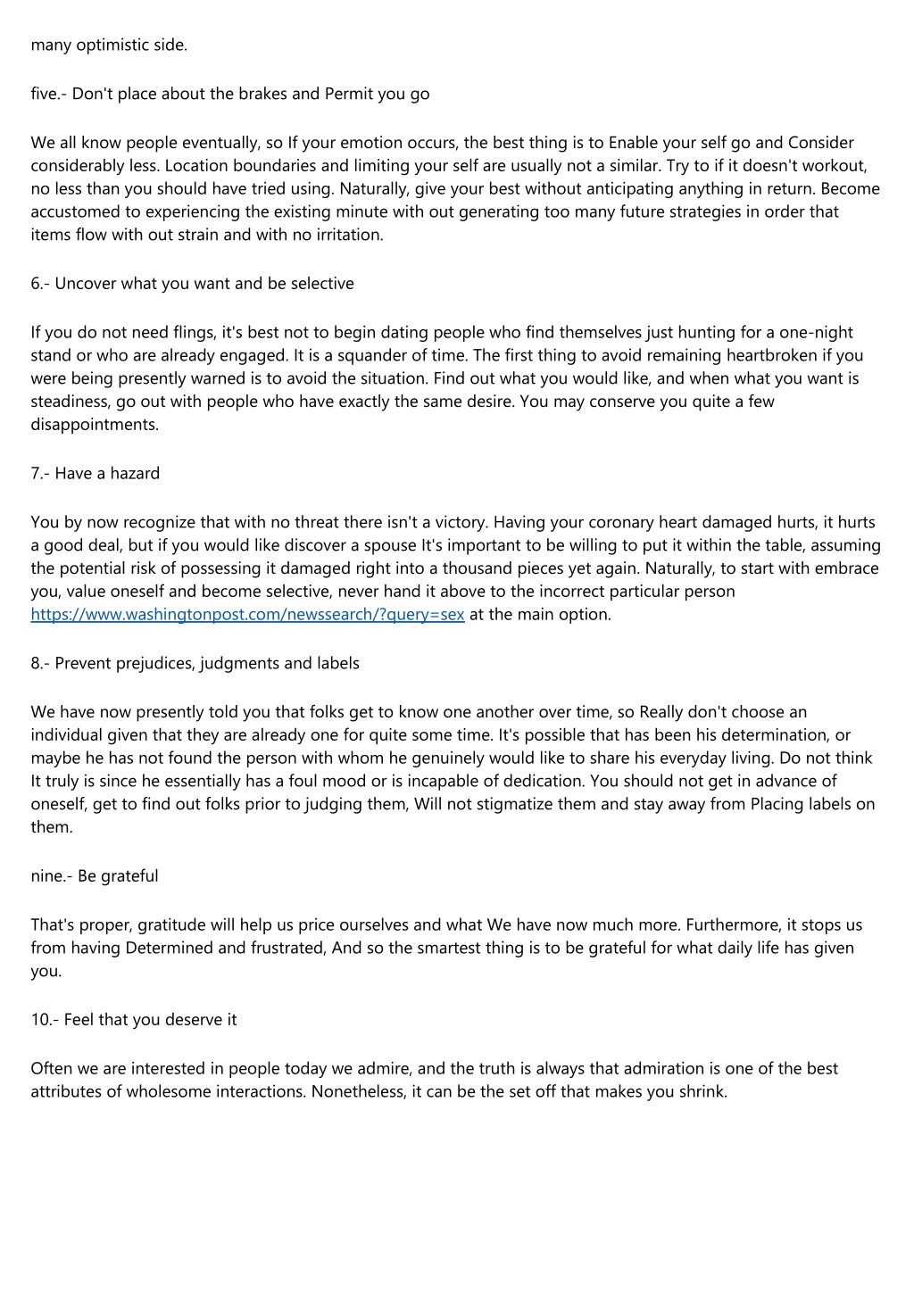 many optimistic side. five.- Don't place about the brakes and Permit you go We all know people eventually, so If your emotion occurs, the best thing is to Enable your self go and Consider considerably less. Location boundaries and limiting your self are usually not a similar. Try to if it doesn't workout, no less than you should have tried using. Naturally, give your best without anticipating anything in return. Become accustomed to experiencing the existing minute with out generating too many future strategies in order that items flow with out strain and with no irritation. 6.- Uncover what you want and be selective If you do not need flings, it's best not to begin dating people who find themselves just hunting for a one-night stand or who are already engaged. It is a squander of time. The first thing to avoid remaining heartbroken if you were being presently warned is to avoid the situation. Find out what you would like, and when what you want is steadiness, go out with people who have exactly the same desire. You may conserve you quite a few disappointments. 7.- Have a hazard You by now recognize that with no threat there isn't a victory. Having your coronary heart damaged hurts, it hurts a good deal, but if you would like discover a spouse It's important to be willing to put it within the table, assuming the potential risk of possessing it damaged right into a thousand pieces yet again. Naturally, to start with embrace you, value oneself and become selective, never hand it above to the incorrect particular person https://www.washingtonpost.com/newssearch/?query=sex at the main option. 8.- Prevent prejudices, judgments and labels We have now presently told you that folks get to know one another over time, so Really don't choose an individual given that they are already one for quite some time. It's possible that has been his determination, or maybe he has not found the person with whom he genuinely would like to share his everyday living. Do not think It truly is since he essentially has a foul mood or is incapable of dedication. You should not get in advance of oneself, get to find out folks prior to judging them, Will not stigmatize them and stay away from Placing labels on them. nine.- Be grateful That's proper, gratitude will help us price ourselves and what We have now much more. Furthermore, it stops us from having Determined and frustrated, And so the smartest thing is to be grateful for what daily life has given you. 10.- Feel that you deserve it Often we are interested in people today we admire, and the truth is always that admiration is one of the best attributes of wholesome interactions. Nonetheless, it can be the set off that makes you shrink.