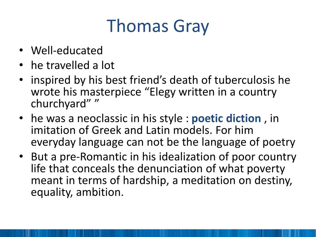 The “ Elegy” • The poets were characterized a reflective mood, a melancholy that favoured long solitary walks in the woods or on the hills. • Elegyis a kind of poem lamenting someone’s death or meditating on death in general • In contrast to the most of the neo-classical writers only interested in Man as a social being rather than an individual with his own soul, they escaped in nature or in the humble life of the country people, rediscovering the pleasure of meditation.