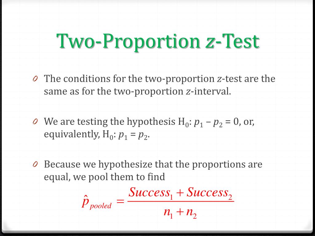 Two-Proportion z-Test • The conditions for the two-proportion z-test are the same as for the two-proportion z-interval. • We are testing the hypothesis H0: p1 – p2 = 0, or, equivalently, H0: p1 = p2. • Because we hypothesize that the proportions are equal, we pool them to find