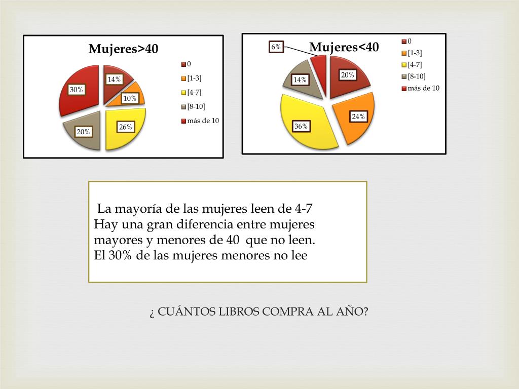 La mayoría de las mujeres leen de 4-7 Hay una gran diferencia entre mujeres mayores y menores de 40 que no leen. El 30% de las mujeres menores no lee ¿ CUÁNTOS LIBROS COMPRA AL AÑO?