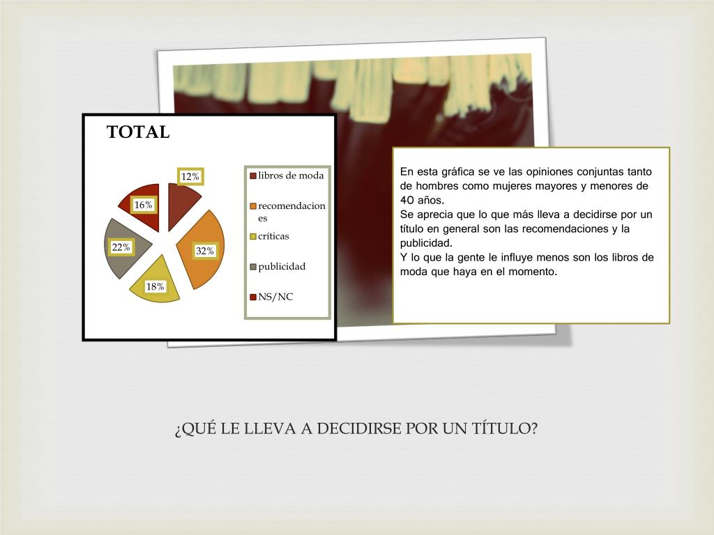 En esta gráfica se ve las opiniones conjuntas tanto de hombres como mujeres mayores y menores de 40 años. Se aprecia que lo que más lleva a decidirse por un título en general son las recomendaciones y la publicidad. Y lo que la gente le influye menos son los libros de moda que haya en el momento. ¿QUÉ LE LLEVA A DECIDIRSE POR UN TÍTULO?