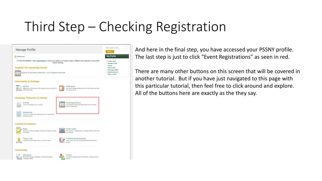 Third Step – Checking Registration And here in the final step, you have accessed your PSSNY profile. The last step is just to click “Event Registrations” as seen in red. There are many other buttons on this screen that will be covered in another tutorial. But if you have just navigated to this page with this particular tutorial, then feel free to click around and explore. All of the buttons here are exactly as the they say.