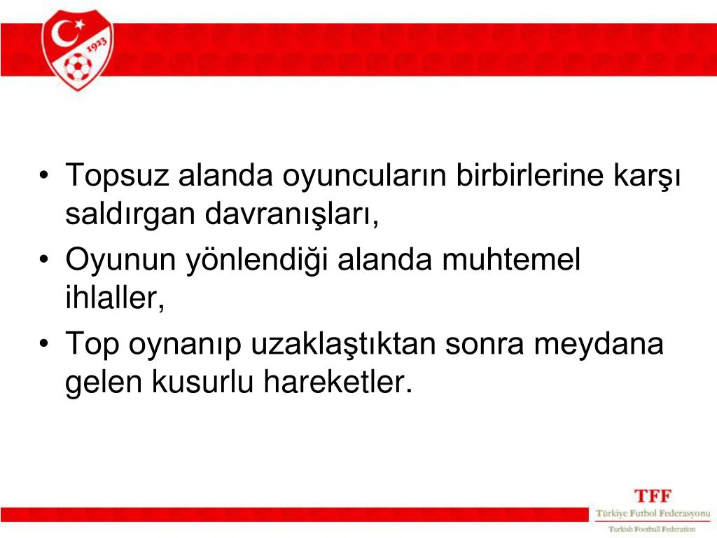 Topsuz alanda oyuncuların birbirlerine karşı saldırgan davranışları, • Oyunun yönlendiği alanda muhtemel ihlaller, • Top oynanıp uzaklaştıktan sonra meydana gelen kusurlu hareketler.