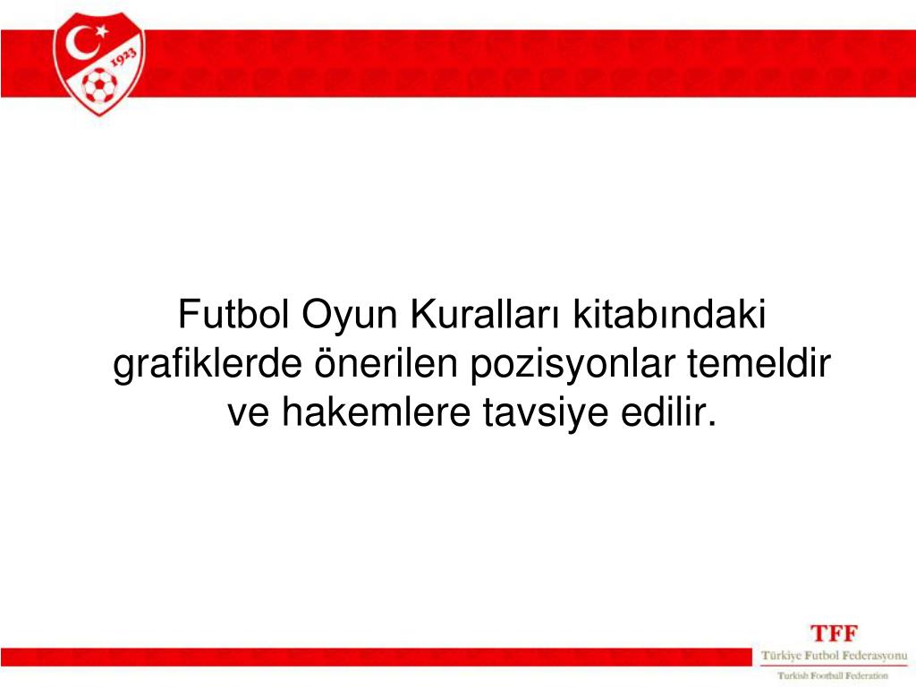 Futbol Oyun Kuralları kitabındaki grafiklerde önerilen pozisyonlar temeldir ve hakemlere tavsiye edilir.