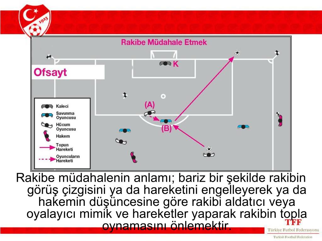 Rakibe müdahalenin anlamı; bariz bir şekilde rakibin görüş çizgisini ya da hareketini engelleyerek ya da hakemin düşüncesine göre rakibi aldatıcı veya oyalayıcı mimik ve hareketler yaparak rakibin topla oynamasını önlemektir.