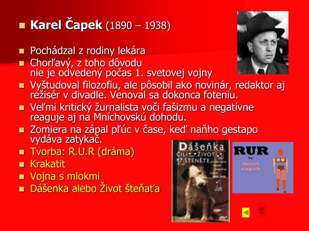 Karel Čapek (1890 – 1938) • Pochádzal z rodiny lekára • Chorľavý, z toho dôvodu nie je odvedený počas 1. svetovej vojny • Vyštudoval filozofiu, ale pôsobil ako novinár, redaktor aj režisér v divadle. Venoval sa dokonca foteniu. • Veľmi kritický žurnalista voči fašizmu a negatívne reaguje aj na Mníchovskú dohodu. • Zomiera na zápal pľúc v čase, keď naňho gestapo vydáva zatykač. • Tvorba: R.U.R (dráma) • Krakatit • Vojna s mlokmi • Dášenka alebo Život šteňaťa