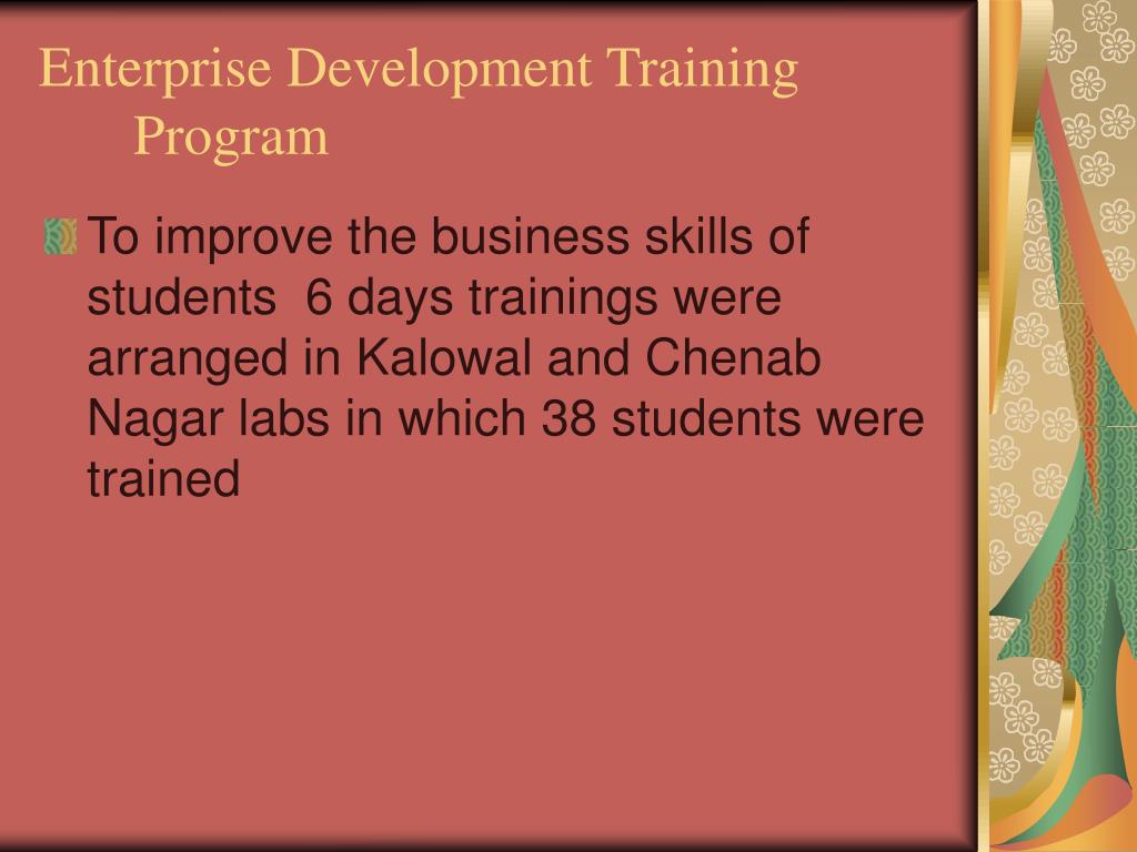 Enterprise Development Training Program • To improve the business skills of students 6 days trainings were arranged in Kalowal and Chenab Nagar labs in which 38 students were trained