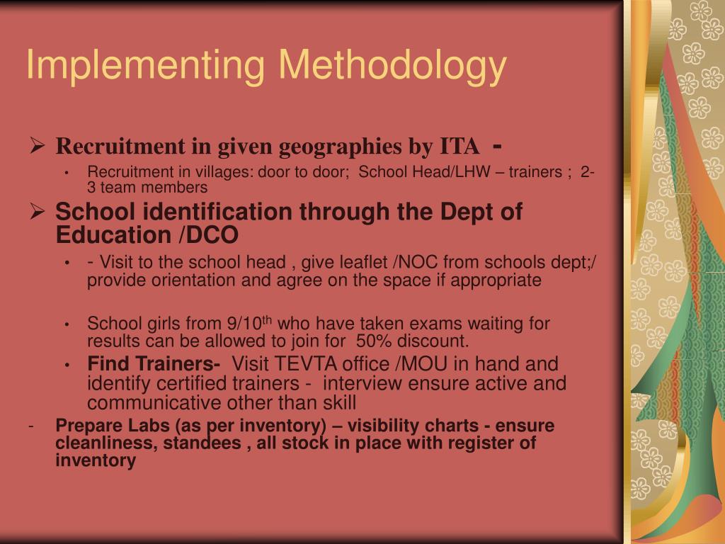 Implementing Methodology • Recruitment in given geographies by ITA - • Recruitment in villages: door to door; School Head/LHW – trainers ; 2-3 team members • School identification through the Dept of Education /DCO • - Visit to the school head , give leaflet /NOC from schools dept;/ provide orientation and agree on the space if appropriate • School girls from 9/10th who have taken exams waiting for results can be allowed to join for 50% discount. • Find Trainers- Visit TEVTA office /MOUin hand and identify certified trainers - interview ensure active and communicative other than skill • Prepare Labs (as per inventory) – visibility charts - ensure cleanliness, standees , all stock in place with register of inventory