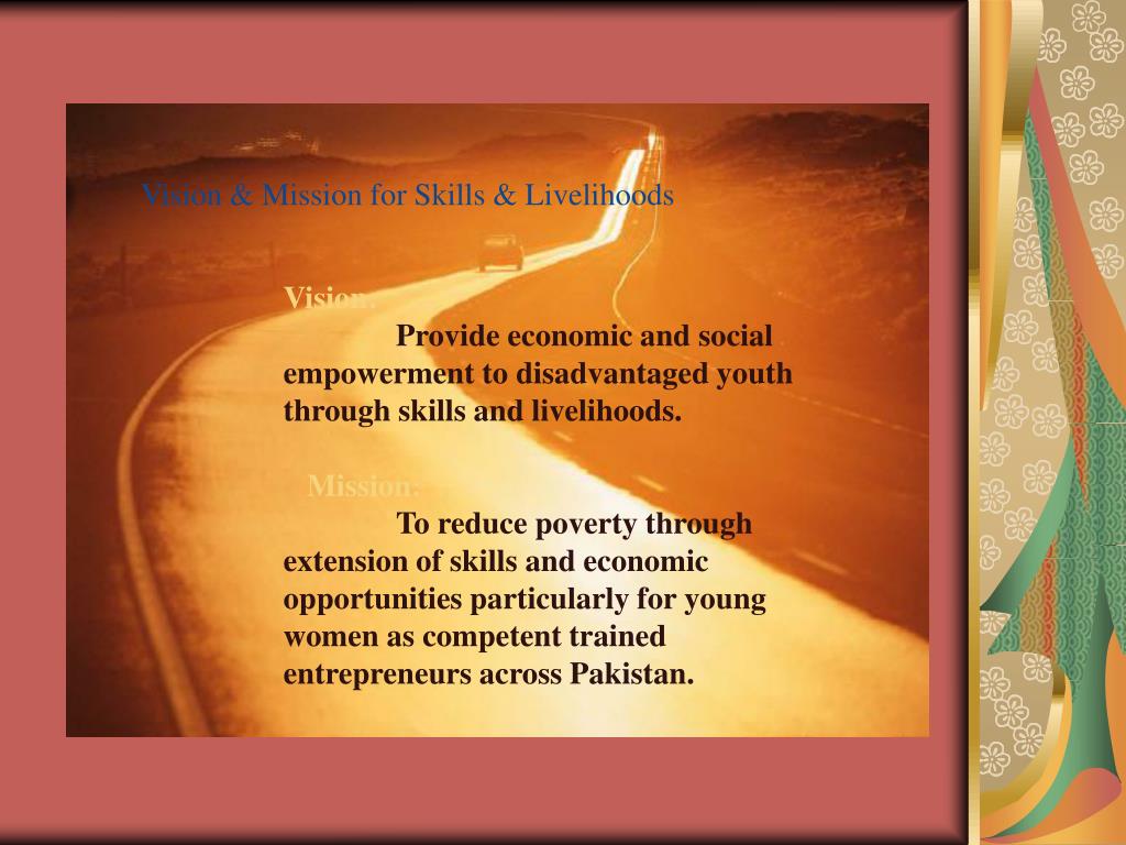 Vision & Mission for Skills & Livelihoods Vision: Provide economic and social empowerment to disadvantaged youth through skills and livelihoods. Mission: To reduce poverty through extension of skills and economic opportunities particularly for young women as competent trained entrepreneurs across Pakistan.