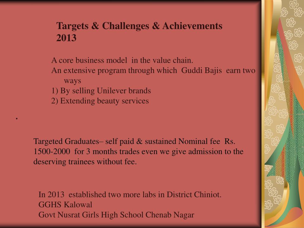 Targets & Challenges & Achievements 2013 A core business model in the value chain. An extensive program through which Guddi Bajis earn two ways 1) By selling Unilever brands 2) Extending beauty services . Targeted Graduates– self paid & sustained Nominal fee Rs. 1500-2000 for 3 months trades even we give admission to the deserving trainees without fee. In 2013 established two more labs in District Chiniot. GGHS Kalowal Govt Nusrat Girls High School Chenab Nagar