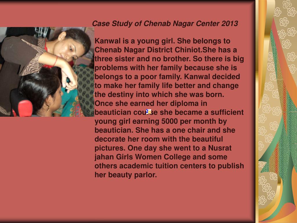 Case Study of Chenab Nagar Center 2013 Kanwal is a young girl. She belongs to Chenab Nagar District Chiniot.She has a three sister and no brother. So there is big problems with her family because she is belongs to a poor family. Kanwal decided to make her family life better and change the destiny into which she was born. Once she earned her diploma in beautician course she became a sufficient young girl earning 5000 per month by beautician. She has a one chair and she decorate her room with the beautiful pictures. One day she went to a Nusrat jahan Girls Women College and some others academic tuition centers to publish her beauty parlor.