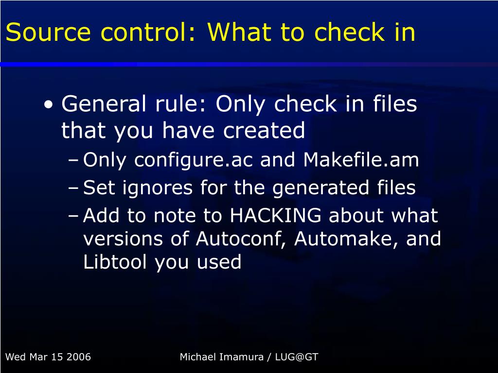 Source control: What to check in • General rule: Only check in files that you have created • Only configure.ac and Makefile.am • Set ignores for the generated files • Add to note to HACKING about what versions of Autoconf, Automake, and Libtool you used Michael Imamura / LUG@GT