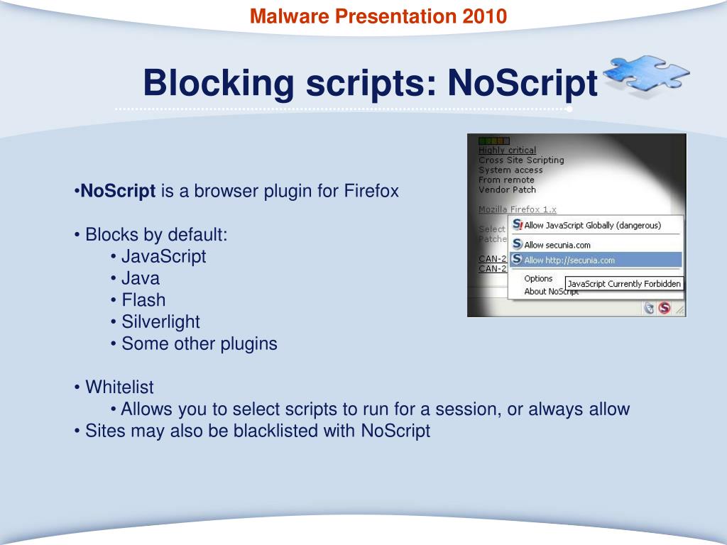 Blocking scripts: NoScript • NoScript is a browser plugin for Firefox • Blocks by default: • JavaScript • Java • Flash • Silverlight • Some other plugins • Whitelist • Allows you to select scripts to run for a session, or always allow • Sites may also be blacklisted with NoScript