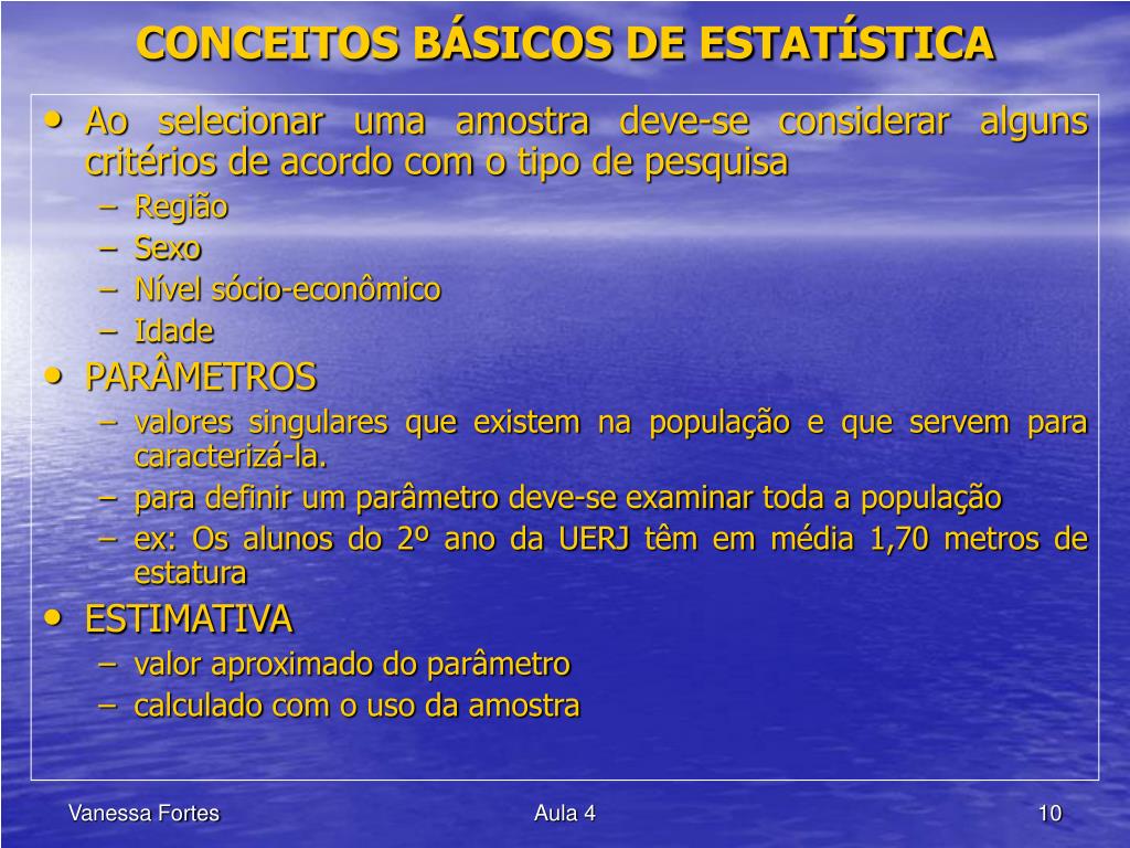CONCEITOS BÁSICOS DE ESTATÍSTICA • Ao selecionar uma amostra deve-se considerar alguns critérios de acordo com o tipo de pesquisa • Região • Sexo • Nível sócio-econômico • Idade • PARÂMETROS • valores singulares que existem na população e que servem para caracterizá-la. • para definir um parâmetro deve-se examinar toda a população • ex: Os alunos do 2º ano da UERJ têm em média 1,70 metros de estatura • ESTIMATIVA • valor aproximado do parâmetro • calculado com o uso da amostra Aula 4