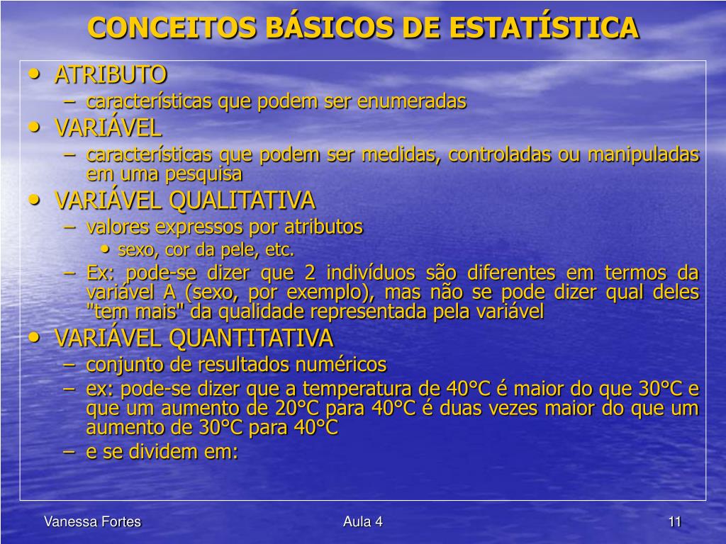 CONCEITOS BÁSICOS DE ESTATÍSTICA • ATRIBUTO • características que podem ser enumeradas • VARIÁVEL • características que podem ser medidas, controladas ou manipuladas em uma pesquisa • VARIÁVEL QUALITATIVA • valores expressos por atributos • sexo, cor da pele, etc. • Ex: pode-se dizer que 2 indivíduos são diferentes em termos da variável A (sexo, por exemplo), mas não se pode dizer qual deles "tem mais" da qualidade representada pela variável • VARIÁVEL QUANTITATIVA • conjunto de resultados numéricos • ex: pode-se dizer que a temperatura de 40°C é maior do que 30°C e que um aumento de 20°C para 40°C é duas vezes maior do que um aumento de 30°C para 40°C • e se dividem em: Aula 4